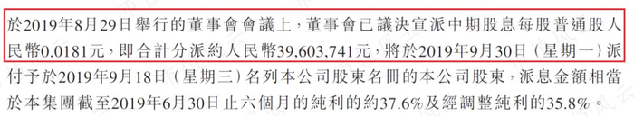 根据五谷磨房的中期业绩报告,公司决定进行中期现金分红,每股普通股派息0.02元,合计0.4亿元,占2019年上半年经调整净利润的35.8%。