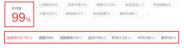 我们再看五谷磨房的核桃芝麻黑豆粉,全部评价数为5.7万+,差评数60+,差评率也是低到只有1%,公司其他的主要产品也是如此。