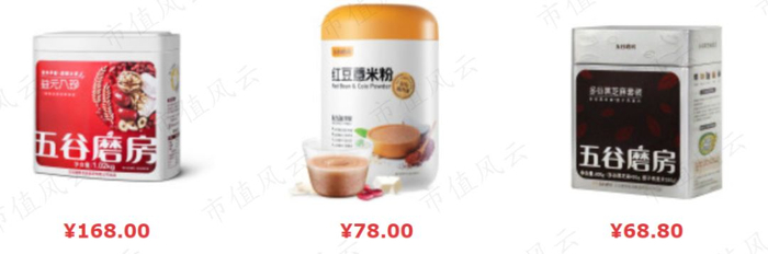 五谷磨房的京东旗舰店显示,单个产品的毛重从100g到1000g不等,价格区间为50元至300元。