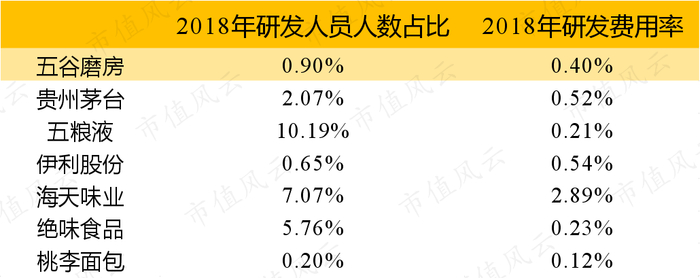 下图是风云君整理的几个市值比较大的食品饮料公司的对比图,茅台的研发费用率也才0.52%,五粮液只有0.21%。
