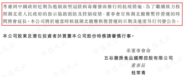 2020年2月25日,五谷磨房发布公告,湖北黄冈生产基地的停工时间将会延长,具体什么时候复工,还要等公司另行通知。