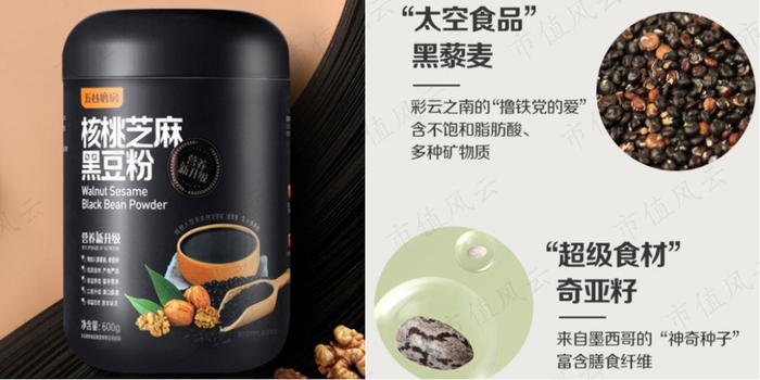 对于有护发、养发需求的消费者,五谷磨房推出“头发空荡荡,黑营养在路上”的核桃芝麻黑豆粉,其核心成分是黑芝麻、黑大豆、黑藜麦和奇亚籽。