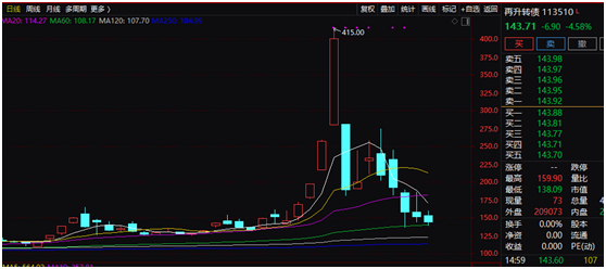 以再升转债为例,此前一段时间该可转债涨幅惊人,吸引了大量短线客参与,3月9日一度涨至415元, 然而,3月10日该可转债便开始大幅调整,一天就暴跌超过50%,截至目前,报143.71元,短短几天时间较高位下跌65.37%。