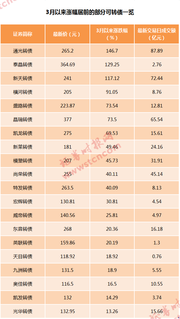 3月以来,A股市场出现调整,沪指下跌6.19%,创业板指下跌8.5%,但本来和股票市场密切关联的可转债市场却相对强势。从区间表现来看, 3月以来上述225只可转债平均上涨2.75%,其中25只可转债涨幅超过10%,通光转债、泰晶转债、新天转债涨幅甚至超过了100%。