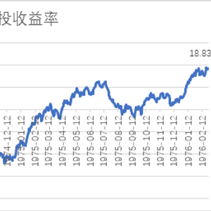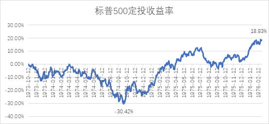 我们对标普500从最高点1973年10月12日111.44点开始定投,到1976年2月24日102.03点结束。期间标普500曾下跌至62.28点,跌幅达44.11%。而使用定投,在每月第一个交易日定投1000元,最多于1974年9月30日亏损-30.42%,此时已投入12000元,而从1975年7月11日开始,累计收益率开始回正,但期间有所下跌,直到1976年2月24日,共投入29000元,累积收益率达到18.83%,复合年化收益为7.55%。