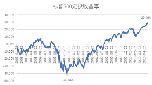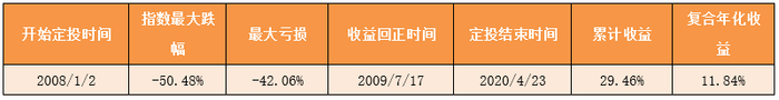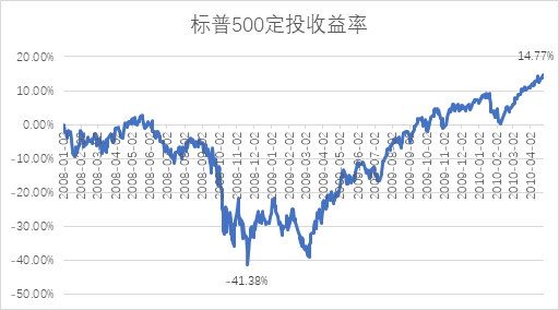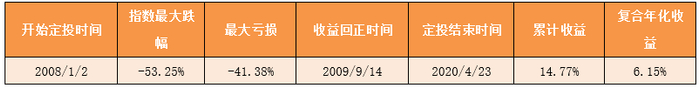 从第三次危机前最高点2008年1月2日的1447.16点开始定投,并于2010年4月23日的1217.28点结束。期间曾跌至676.53点,跌幅达53.25%,区间跌幅为15.88%。而采用定投方法,期间最大亏损为-41.38%,从2009年9月14日开始回正,并于11月5日开始稳定为正。最终累计收益率为14.77%,复合年化收益为6.15%。