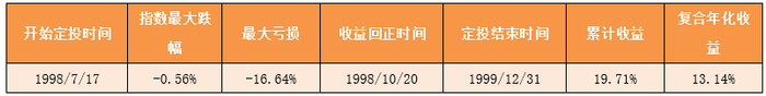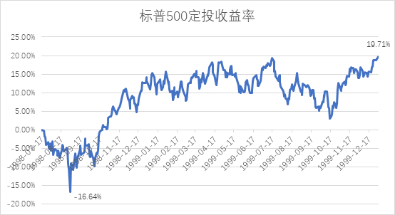 我们对标普500从最高点1998年7月17日1186.75点开始定投,到1999年12月31日1469.25点结束。期初标普500急剧下跌,并于1998年8月31日跌至最低点957.28点,跌幅达19.34%。而使用定投,在每月第一个交易日定投1000元,最多于1998年8月31日亏损-16.64%,此时已投入2000元,而从1998年10月20日开始,累计收益率开始回正,直到1999年12月31日,共投入18000元,累积收益率达到19.71%,复合年化收益为13.14%。