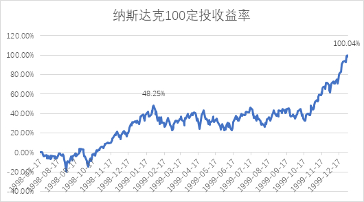 采用同样的方法对同期的纳斯达克100进行定投。纳斯达克从最初1463.97点到1999年12月31日收于3707.83点,期间最低点为1128.88点,最大跌幅22.89%。定投最大亏损19.39%,但很快于1998年10月21日开始回正,直到1999年12月31日,共投入18000元,累积收益率达到100.04%,复合年化收益为60.91%。
