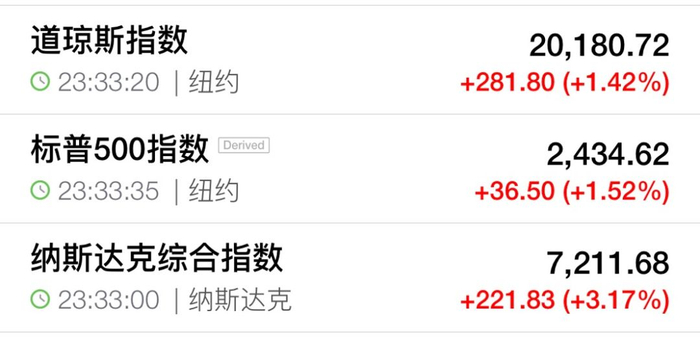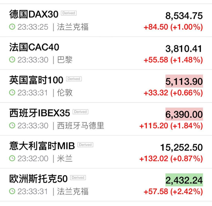 受上述消息影响,美股三大股指翻红并持续攀升,盘中,道指、标普500指数涨幅扩大至2%,纳指涨3.8%。目前优步涨逾40%,特斯拉涨14%,高通、Facebook涨逾8%。欧洲股市也全线飘红。