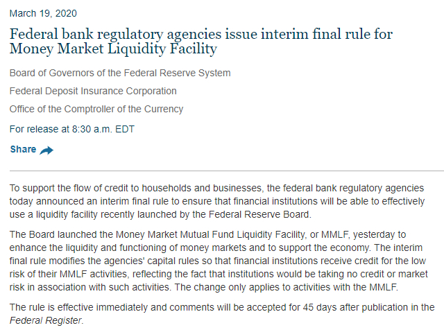 美联储表示,任何从货币市场共同基金买进的资产将排除在银行监管资本规定之外,令银行业者有更多诱因在必要时从这类基金购买资产。贷款将通过波士顿联邦储备银行提供,美国公债交易稳定基金(U.S. Treasury Exchange Stabilization Fund)为该流动性工具提供100亿美元的信用保障。