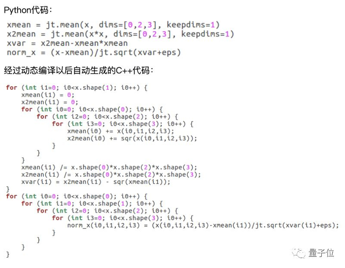 比如,下图中的Python代码编写了神经网络中常用的批归一化层(batch norm), 通过元算子编译器,动态生成了批归一化层C++代码。
