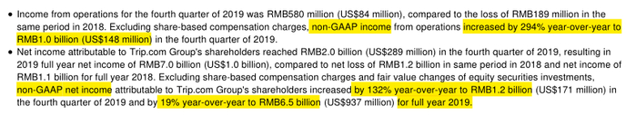 2019年第四季度,按照非通用会计准则,携程的营业利润达到了10亿,同比上涨294%;净利润则达到了12亿,同比上涨了132%。全年利润则是65亿,同比上涨了19%。