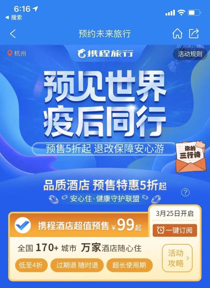 进入携程的首页点击“预约未来旅行”能看到,里面的产品价格比平常要低很多,一个米其林星级餐厅的四人套餐才599元,亲子房加早餐等两晚才不到700。