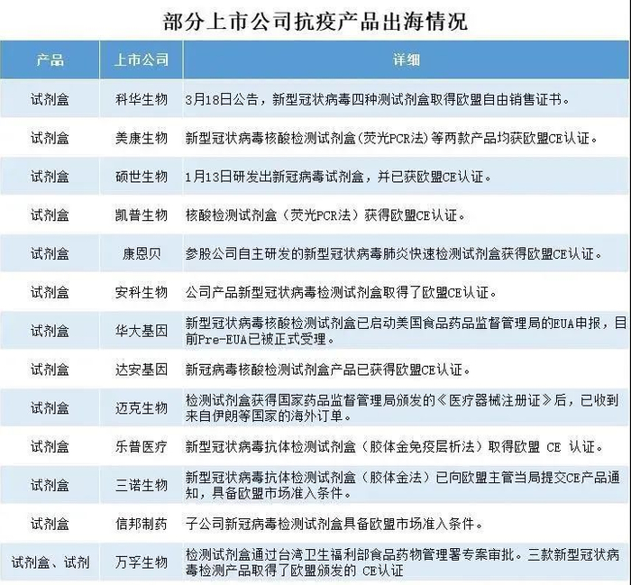 ●截至3月19日,国家药监局共批准新冠病毒检测试剂盒19个,其中核酸检测试剂10个,抗体检测试剂9个。涉及上市公司包括华大基因、海特生物、明德生物、达安基因、万孚生物、迈克生物、丽珠集团等。