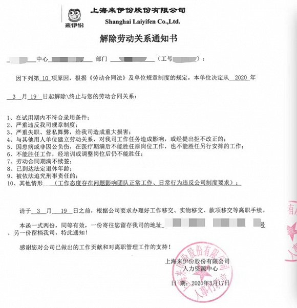 据了解,来伊份品牌系统的HRBP对前述“被裁”员工表示,“N+1的赔偿、年终奖、缴纳3月份公积金都可以有,但是离职证明上还是要写‘不胜任’。”该员工表示,“2019年,部门领导对我的岗位胜任评价是‘完全胜任,来伊份HRBP部经理对我的评价是’有很好的内外部沟通能力;价值观评估为A/A+;年度评分93.4分,这样的评价在离职证明上写‘不胜任’是没有事实依据的。”