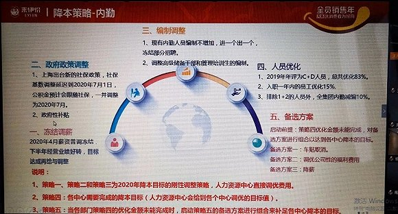 一份来伊份“降本策略-内勤”的文件显示,2019年评为C+D的人员,总共优化83%。入职一年内的员工优化15%。排除1+2的人员外,全集团内勤减编10%。此外,2020年薪资普调将冻结。冻薪裁员范围包括品牌、运营、总裁办等内勤人员,不包括前台和中台人员。