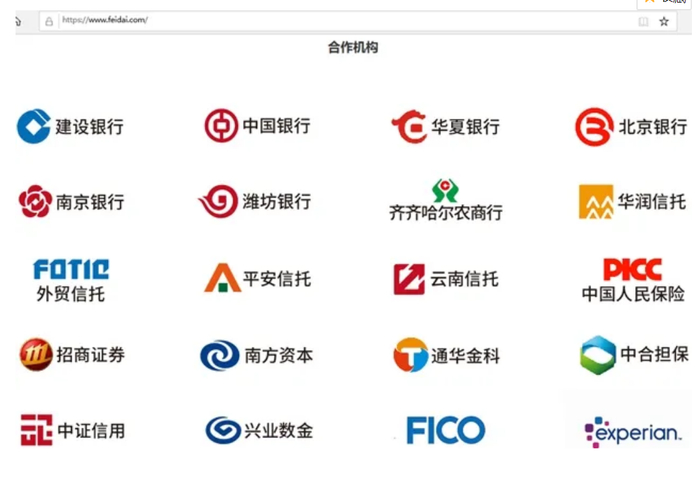 飞贷官网显示,合作机构包括建设银行、中国银行、华夏银行北京银行南京银行、潍坊银行、齐齐哈尔农商行、华润信托、外贸信托、平安信托、云南信托等金融机构、科技公司。