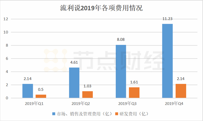 在流利说的各项运营支出中,市场、销售及管理费用和研发费用是占大头。据财报显示,流利说的市场、销售及管理费用从2019年一季度的2.14亿攀升至2019年四季度的11.23亿;研发费用从2019年一季度的0.5亿上涨至2019年四季度的2.14亿。这两项费用四季度的总和13.37亿,更是较一季度的2.64亿翻了五倍。