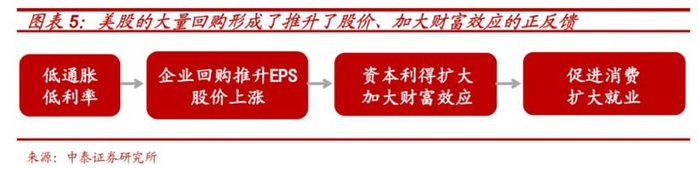如图5所示:持续低利率环境,使不少公司大幅借钱回购自己的股票,而不是用来投资实业。股价的上涨让企业盈利增厚,从而又提高了分红率,同时也让投资者的资本利得扩大,形成财富效应,进而促进消费、创造更多的就业机会,而这反过来又进一步助推了股价的上涨。
