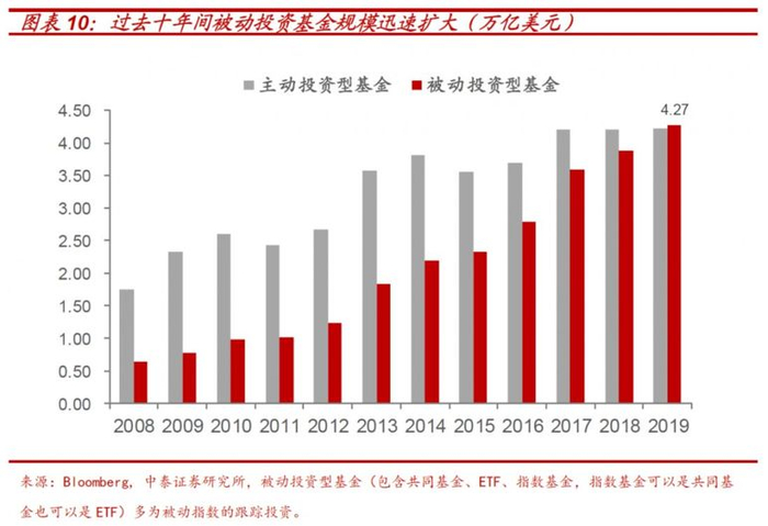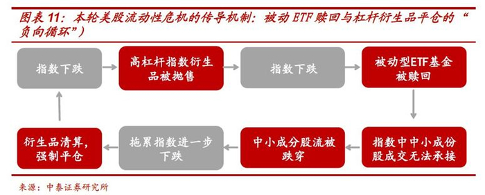 另一方面,“风靡”的被动型基金“跑步进场”。近十年来,被动投资型股票基金规模迅速扩大,成为推升美股估值的主要力量之一。2019年美国股票基金资产规模达到8.5万亿美元,被动基金资产规模占比51%,已经超过主动型管理基金,达到4.27万亿美元。过去十年牛市造就了被动投资的“风靡”,同样地,一旦市场转向下跌,被动基金面临的巨量赎回所造成的卖盘压力,会使其所跟踪指数中的中小成份股的成交额无法承接,这也会加剧市场流动性的枯竭。
