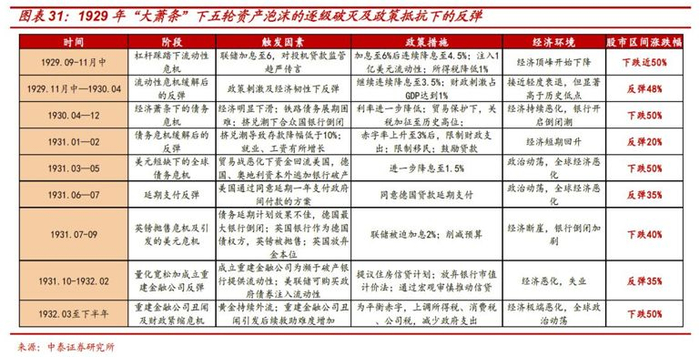从危机演进过程看,参考1929年大萧条,危机不是一蹴而就的,而是经历了全球资产泡沫逐级爆破的五大阶段。每个阶段之间,政策的抵抗和投资者对短期因素的放大,都造就了平均近30%的五轮季度级别的大反弹,而每轮反弹之后,伴随经济基本面的进一步恶化和新风险的引爆都会造成新一波更猛烈的下跌。