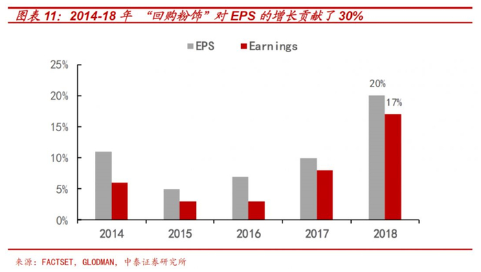 “回购粉饰”背后:企业内生增长乏力。从美国上市公司业绩拆分角度看,过去十五年,美国上市公司的每股盈利(EPS)年复合增速为11%,而企业利润复合增速仅为8%,两者间3%的差值就是回购“人为推升”的“增长”。也就是说,当前美股EPS增长之中,公司通过回购股票所贡献的“虚增”占比接近30%,本就与股价涨幅不相匹配的业绩增长之中,还存在着较为明显的“注水”现象。