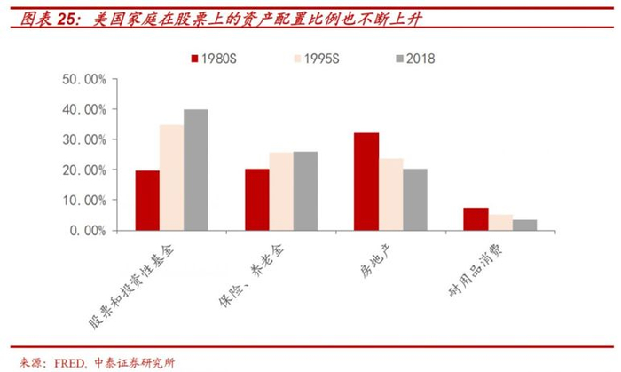 而且,伴随美股“十年牛市”的赚钱效应,美国家庭在股票上的资产配置比例也不断上升,目前已达到40%,这一比例与历史上2002年互联网泡沫时期接近。