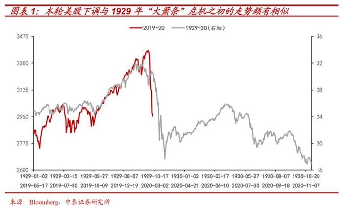 本轮美股危机目前所处阶段:第一轮流动性危机的中后期。本轮危机未来将如何演绎?对照1929年危机,我们认为,当前或正处于如第一轮流动性危机的中后期,即相当于“大萧条”时1929年10-11月中旬左右。