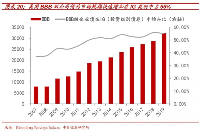从数据上看,美国BBB级公司债的市场规模从2008年初的7269亿美元增至2019年的3.2万亿美元,在投资级债券中的占比超过55%。