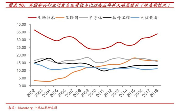 比孱弱的制造业产出更为严重的是:美国企业对于创新投入的下降。企业研发支出占现金比重仅为11%远低于用于股票回购的27%。从各细分成长行业的研发支出占营收比重看,与五年前相比,除了生物技术(33%)研发支出占比保持增长外,包括互联网、半导体(研发占比15%)、软件及消费电子(12%)等在内的行业研发支出占比均没有明显的提升,甚至略微下降。