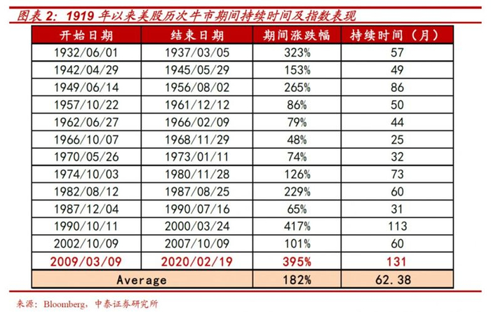 本轮美股上涨始于08年金融危机之后,至20年2月,标普500指数涨幅395%,形成“十年牛市”。从涨幅和持续时间看,本轮美股牛市在美股历史上涨幅和持续时间分别名列第2和第1。然而,与以往美股牛市伴随的经济高速增长及科技创新大周期的不同在于: