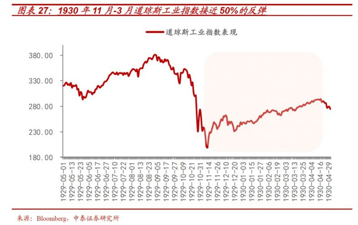 在1929年危机的第一阶段,市场因为杠杆资金踩踏和连环平仓引起的流动性危机,经历多次单日跌幅达10%以上的“黑色星期×”。这期间,尽管有美联储的降息举措(6%降至5%),流动性注入(1亿美元)以及企业家协会自发回购及护盘等触发的多个短期5%左右单日反弹,但整体下跌幅度仍接近50%。但在此之后的,1930年1-4月,美股却迎来了持续时间超过一个季度,涨幅近48%的第一轮大幅反弹。