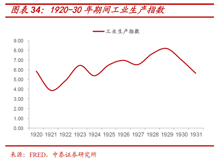 在论述低利率环境下,美国企业、居民、政府资产负债表脆弱性的同时,我们对于本轮美股风险可能的演绎过程进行展望。这里我们依然以1929年“大萧条”作为模板。之所以选择“大萧条”作为模板,除了前文所述的美股技术面,资金面,估值,企业、居民等债务情况与1929年等危机有诸多相似之处以外。1929年“大萧条”相对漫长的演进时间中,各类资产泡沫的依次爆破的传导过程、市场反应、政策抵抗等均被演绎得淋漓尽致,堪称债务危机研究的“范本”。