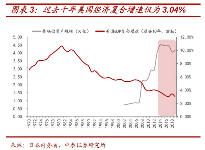 首先,本轮美股牛市始于08年底至09年初美联储的量化宽松(QE),历经奥巴马政府时期三轮QE和特朗普政府减税、降息,而过去十年美国经济整体复合增速仅为3.04%,仍处于下台阶通道,且过去十年整体并未产生“颠覆式创新”。