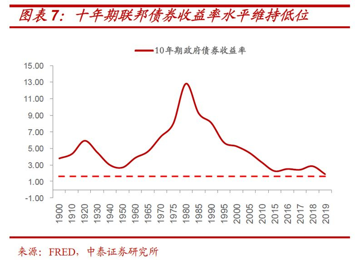 根据2019年年中,美国债务管理办公室对美国年度公共债务发行的最新预测:从2024年基本赤字降为零开始,美国新发行的公共债务所筹的资金就将全部用于支付已有债务产生的净利息,其规模介于7000亿到1.2万亿美元或更多。这一脆弱的财政基础,使得美国进一步通过激进财政政策刺激经济的路径并不现实。