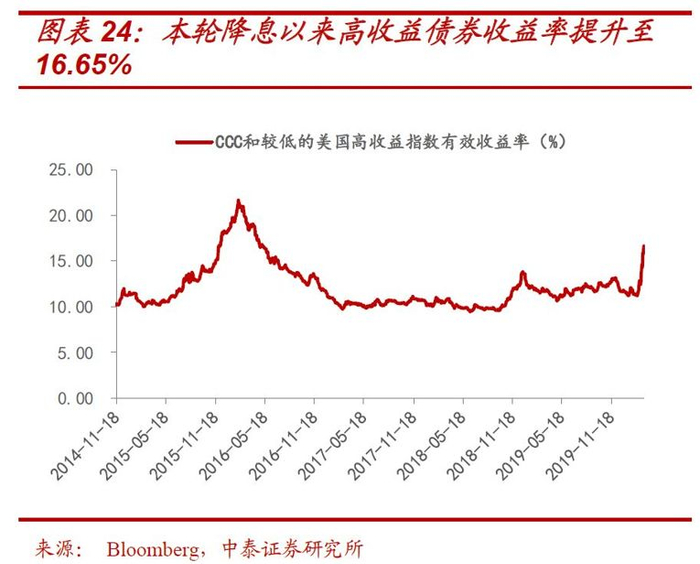 同时,疫情对资本市场及经济的冲击,显著降低了投资者的风险偏好,信用利差会持续扩大,这将进一步加大低评级债务企业资金成本、融资难度和还款压力。自2月中旬以来,尽管美联储已降息150bp,美国高收益债券收益率却从11.25%提升至16.65%,BBB级公司债的期权调整价差(OAS)从135上升至290bp。