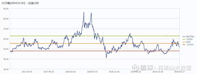 可以看出,市盈率最高曾经到过97倍,随着业绩增加和股价滞涨才逐渐降低。2020年如果按照比较保守的20%利润增速预估,现价对应的市盈率约为43倍,低于2017年初的51倍,因此,估值相比自身已经基本不存在泡沫。真正的好股票消化估值可以通过横盘的方式以时间换空间,片仔癀即是如此。