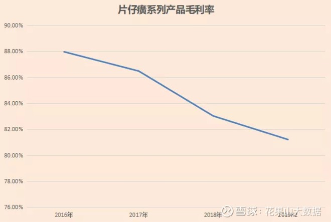 片仔癀此言非虚,原材料的上涨导致毛利率连续下滑,侵蚀了公司利润。公司定期报告中分拆的“肝病用药”可以等同于片仔癀系列产品,2016年以来的毛利率从87.96%下滑到2019年中报的81.21%,这还是在2017年提价的情况下发生的,表明提价幅度完全跟不上原材料价格上涨的速度。