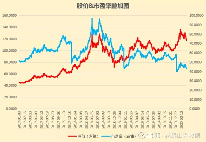 其实自2018年5月28日股价最高上冲131.98元之后,片仔癀始终在消化估值,持续了近两年,直到今年1月21日股价才刷新前高,下面的股价和市盈率叠加图直观地展示了全过程。