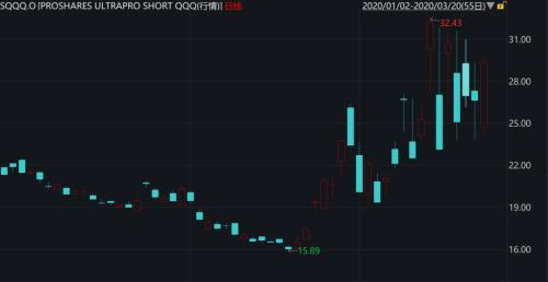 以纳指三倍做空ETF(SQQQ)为例,该ETF走势与纳斯达克100指数相反,波动幅度约为纳斯达克100指数的3倍,即纳斯达克100指数下跌1%对应该ETF指数上涨约3%。从2月19日的低点算起,SQQQ已经涨了52.46%。但是中间波动巨大。