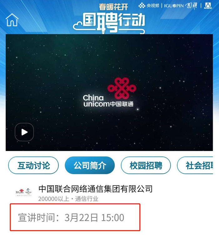 最后,人力资源部负责人在面人无数后,有9个字送给想要投简历的同学,这也是公司招聘最需要的员工特质:想干事、能干事、干成事。如果你也是这样的人,快投递简历,和志同道合的朋友去开心地“挖矿”吧!明天(3月22日),“春暖花开 国聘行动”云宣讲精彩继续,中国联合网络通信集团有限公司(简称“中国联通”)在央视频App等你。
