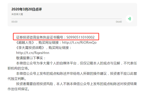 值得注意的是,该音频已添加了个人证券投资咨询业务执业证书编号。记者注意到,李大霄的公众号今天、前天、3月18日推送的市场点评内容均添加了证书编号,此前的点评内容均未添加。