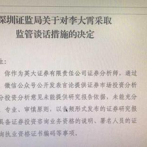 《监管决定》要求李大霄于3月20日前携带有效身份证到深圳证监局接受监管谈话。从近期李大霄公众号上按规定添加证书编号来看,被约谈一事或并非空穴来风。