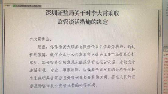 今天,一份网传文件显示,英大证券分析师李大霄被证监会约谈。