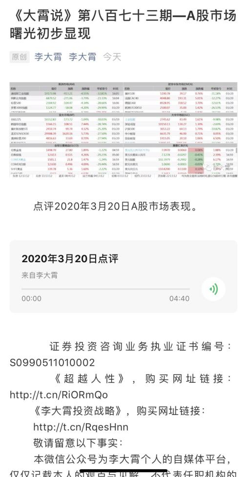 李大霄一直以来坚持在微信公众号“李大霄”上发布音频股评,最近一篇是在21日上午11点55分发布的,主题是点评2020年3月20日A股市场表现,只有一张行情软件截图和一个将近5分钟的音频,没有研报、没有图表。