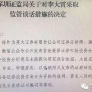 一封盖着监管红戳的《深圳证监局关于对李大霄采取监管谈话措施的决定》文件截图,在财经圈里广泛流传。截图显示,李大霄作为英大证券分析师,通过微博、微信公众号公开发表言论提供证券市场投资分析意见,部分投资分析意见未能提供研究报告依据,未能充分遵循客观、专业、审慎原则。以音频形式发布的证券研究报告未载明具备证券投资咨询业务资格的说明、数名人员的证券投资咨询执业资格证书编码等事项。
