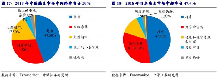 中国燕麦食品行业的线上渠道逐渐兴起。日本早餐燕麦行业的主要销售渠道为超市等线下渠道,2018年超市销售占比达47.4%,而网络零售占比仅仅达3.9%。与日本不同,近几年中国早餐燕麦食品行业渠道构成发生了巨大变化,由于燕麦食品保质期相对较长且存储较为方便,线上渠道逐渐成为燕麦早餐食品的主要渠道。中国早餐燕麦行业的网络零售渠道占比自2013年的2%快速增长至2018年的30%,线上渠道逐渐兴起。如桂格早在2016年便布局线上渠道,布局天猫、京东、苏宁易购等渠道,市占率自2013年的14.4%增至2018年的19.2%,桂格借助电商渠道实现了市占率稳步增长。