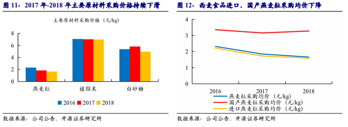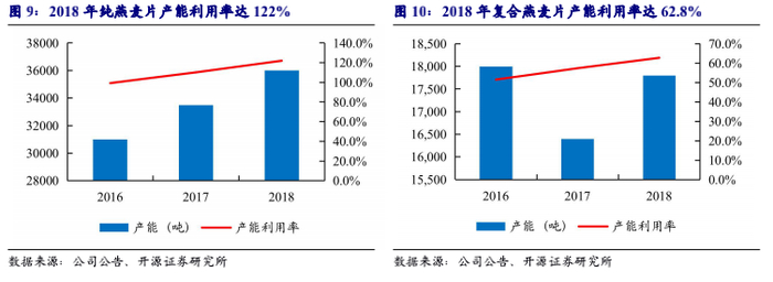 西麦食品具备规模优势,议价能力强:(1)规模化生产,产能利用率高,摊薄成本。公司规模化生产,产能利用率高,2018年纯燕麦片、复合燕麦片的产能利用率分别为122%、62.8%。西麦食品具备规模优势,可摊薄单位产品固定成本,成本优势较强。