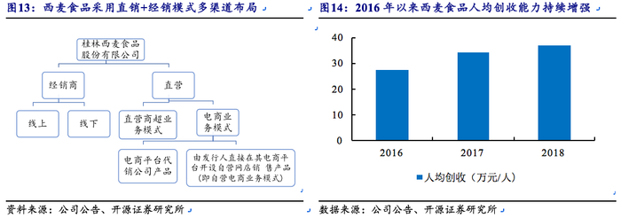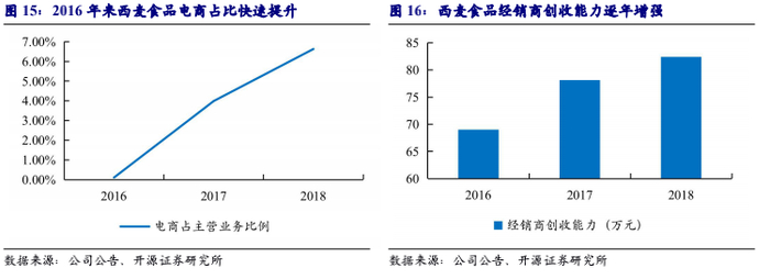 (2)经销:公司采用款到发货的买断式销售模式,通过经销模式实现渠道下沉,进一步开拓社区、乡村、乡镇,渠道包括商超、电商等。目前西麦食品渠道已下沉至县级市场及部分重点乡镇市场,公司经销商数目自2016年的729家增至2018年的924家,且经销商平均创收能力自2016年的69万元增至2018年的82.4万元,经销商的数量和创收能力都在持续增强。