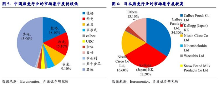 目前中国燕麦行业集中度仍较低,根据Euromonitor,目前行业CR2为33.2%,而饮食习惯与中国相近的日本早餐燕麦行业CR2为66.5%。中国的行业集中度仍较低,未来随着燕麦消费者品牌意识进一步增强,燕麦行业集中度仍旧有很大的提升空间。